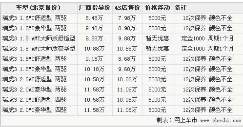 在剛剛結束的北京車展上,奇瑞瑞虎家族推出了兩款大師版車型,分別為1.8 AMT舒適型與1.8 AMT豪華型,售價是9.88萬和10.88萬。奇瑞瑞虎大師版的上市引起了媒體的廣泛關注,作為國內首款配備五擋自動機械變速箱的SUV,該車型的上市進一步完善了瑞虎的產品體系,也為消費者帶來更多選擇。網上車市從北京奇瑞經銷商處了解到,目前購買瑞虎3可獲得一定幅度優惠。