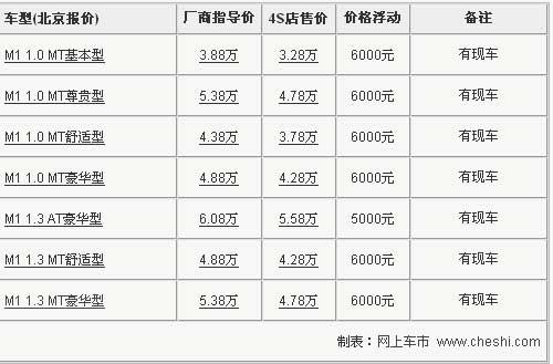 據(jù)瑞麒汽車4S店銷售人員介紹,瑞麒M1車型目前銷量平穩(wěn),全系車型的降價(jià)幅度也較之前有所提高,1.0L手動(dòng)檔車型和1.3L手動(dòng)檔全系現(xiàn)金優(yōu)惠6000元,1.3L自動(dòng)檔車型優(yōu)惠5000元。另外,瑞麒M1車型目前有廠家促銷活動(dòng),店內(nèi)有幾臺(tái)1.3L手動(dòng)檔車型以8000元的大幅度降價(jià)進(jìn)行銷售,數(shù)量有限,有意購(gòu)買的朋友可到到店詳詢。