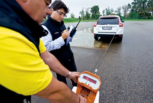 這一測試的目的在于測量車輛的牽引力,我們要使用一個十分精確的測量范圍達數千千克的測力計。正如在照片中看到的,車輛的四個輪子都在濕滑的大理石上,我們在上面說過,其附著力與在冰面上差不多。測力計的一邊通過一條鋼索與車體相連,另一邊固定在一個位置上。測試員啟動汽車把鋼索拉直,然后繼續加油直到車輪開始打滑,這時很多因素都要考慮,包括發動機功率、車的重量、輪胎的合成材料等,這些都是重要的參考數據。四驅車比兩驅車明顯占據上風,特別是XC60,其四驅版的牽引力比兩驅版高出了74%。Kuga兩個版本的差距為41%,略微小些。需要說明的是,正像前面說過的,沃爾沃兩款車的功率相差30馬力,其他方面沒有大的差別。在主要測試結束后,我們換了個地點重復剛才的測試,不是四個輪子都在大理石上,而是兩個在大理石上,兩個在瀝青上,仍然為濕滑路面。這也是為了測試防滑系統的功效,這時需要差速器的機械鎖止裝置發揮作用,Kuga和XC60上都沒有這一裝置。兩個輪子在瀝青上增加了附著力,可以看到測力計上顯示的數字與上次相比四輛車都增大了。福特兩驅車牽引力為602千克,四驅為820千克;沃爾沃兩款車的差距還是那么大,兩驅為710千克,四驅為1050千克。