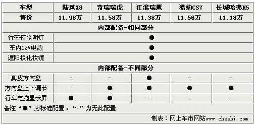 既然是一款SUV,我們就不能以評(píng)價(jià)轎車的標(biāo)準(zhǔn)來衡量它,畢竟造車的出發(fā)點(diǎn)是不同的。SUV車型更看重內(nèi)部載人載物的能力、駕駛安全性等能力。一些時(shí)尚新鮮的內(nèi)部配置我們還是留著在轎車上體驗(yàn)吧。三款車的內(nèi)部都配備了行李箱照明燈、12V電源和遮陽(yáng)板化妝鏡。但是在5款車中,僅有瑞鷹為使用者提供了更顯檔次的真皮方向盤。