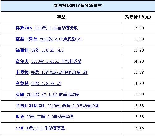 汽車之家的年度大戲又開(kāi)鑼了!經(jīng)過(guò)兩個(gè)多月的精心策劃和準(zhǔn)備,我們組織了這次大型的緊湊型車全面對(duì)比!我們的目標(biāo)是將市場(chǎng)上主流的緊湊型車一網(wǎng)打盡,來(lái)一次從里到外、從靜到動(dòng)的全面PK。這次一共邀請(qǐng)到了以下十款車型,他們款型相對(duì)都比較新,消費(fèi)者在選車的時(shí)候經(jīng)常徘徊其中。從今天開(kāi)始,我們將分別從外觀與做工、內(nèi)飾與空調(diào)、儲(chǔ)物空間、乘坐空間等四個(gè)靜態(tài)方面和動(dòng)力與操控性能、燃油經(jīng)濟(jì)性等兩個(gè)動(dòng)態(tài)方面以及保養(yǎng)售價(jià)等對(duì)這十款車進(jìn)行全面的對(duì)比。