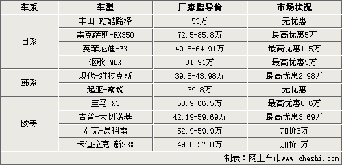 在眾多SUV車型的的范圍中,我們精選了10款各種具有獨(dú)特代表性的車型作為對(duì)象,其中囊括的日系、韓系和歐美車型,這樣更具有市場針對(duì)性,車型的價(jià)格范圍也從40萬波及至80萬元。整體呈現(xiàn)出事態(tài)強(qiáng)烈的各種狀態(tài),優(yōu)惠幅度最大的是寶馬X3車型,最高優(yōu)惠8.6萬;而在天平的另一端,加價(jià)最高的是別克昂科雷和卡迪拉克新SRX,加價(jià)額度均為3萬元。當(dāng)然也有不加價(jià)的車型分別是豐田FJ酷路澤和起亞霸銳。