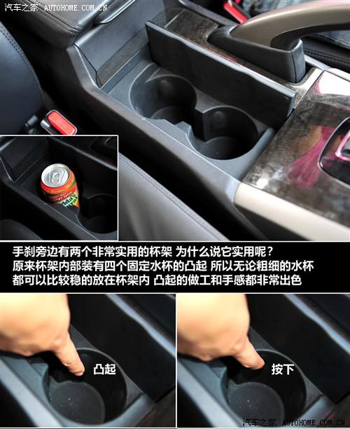 手剎邊上的杯架做工非常不錯,內部帶有彈性的卡扣,各種粗細大小的水杯都可以比較穩的放在其中。而扶手箱下的儲物盒雖然深度一般,但是內部的空調出風口大大增加了它的實用性,兩個帶有空調出風口的儲物空間是車內絕對的亮點。
