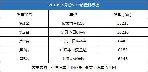 而其中最讓人欣慰的,還是SUV市場,5月份共銷售10.31萬輛,環比下降0.84%,同比增長1.1倍。我們不妨來看看銷量榜上的SUV前五名,他們占據了SUV總銷量的43%,可以說購買SUV的近一半消費者都選擇的是這5款車。