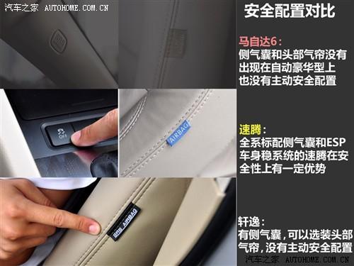 對比配置,我們先從安全性配置開始,在這方面,無疑速騰是最大的贏家,因為馬自達6除了最基本的ABS+EBD和雙氣囊之外,沒有別的更多安全配置;而速騰是全系標配ESP和側氣囊的;軒逸盡管主動安全配置沒什么亮點,但這款高配車型有側氣囊,而且可以選裝頭部氣簾,所以還是比馬自達6更勝一籌。