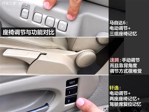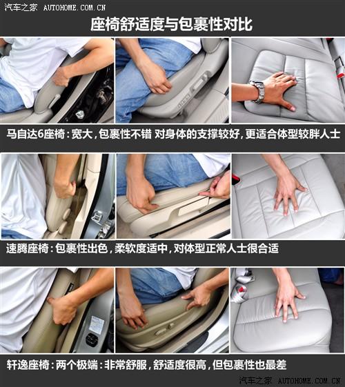 在這三款車中,中型車的馬自達6具有最寬大的座椅和三組座椅記憶,只是他的天窗面積實在有點小;速騰的的配置影響了便利性,但卻是三款車中唯一有后排出風口的;軒逸的座椅就像家里的沙發一些,而且在開門的瞬間還可以自動后撤來方便上車,但幾乎沒什么包裹性可言,不利于高速行駛。