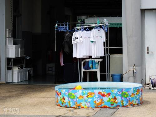 走進賽車場后,我們發(fā)現每個pit房后面都有一個兒童游泳池↑