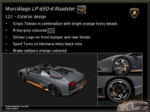 近日,蘭博基尼蝙蝠LP650-4 Roadster敞篷車外觀和內(nèi)飾的全套官方照片在LamboCars論壇上泄露,這是否就是蘭博基尼方面在日內(nèi)瓦車展前的預(yù)熱目前還不得而知,但是通過“照片”,基本可以判斷這是公司內(nèi)部宣傳用的幻燈片。