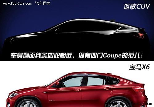 它正是前一陣才剛剛曝光的全新謳歌CUV(Car-Based Utility Vehicle),從字面上看也是一款Crossover車型。與之前披露的諜照或合成圖相比,此次曝光的官方圖赤裸裸的向寶馬X6發起了挑釁。從車身整體的造型來看,這款尚沒有定名的新車完全如X6一般有著四門Coupe轎跑車的影子;同時,在細節之處也進一步深化這種概念,它有隱藏式的后門把手(意大利轎跑慣用設計)、異常凸出的前后輪拱以及同TL一般的尖銳尾燈造型等。