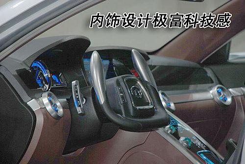 在內飾方面,長城CHC011的方向盤采用極富未來科技氣息的設計風格,雖然看上去很拉風,但卻一點也不實用。另外,內飾有很多地方都采用藍色背景光的設計,展示了整車在科技方面的造詣。