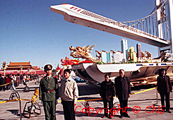 北京天安門廣場十月二日布置了數十輛參加五十周年國慶群眾游行的各省、區彩車,代替花壇供市民觀光,從清晨開始就許多游客在花車前留影。
