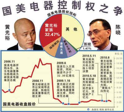 綜觀整個事件,失去人身自由的黃光裕隔空應戰自如,只擁有1.47%國美股權的陳曉“以小博大”,對抗擁有32.47%股權的控制權,看似不可為,實則都在國美特有公司規則下合法騰挪