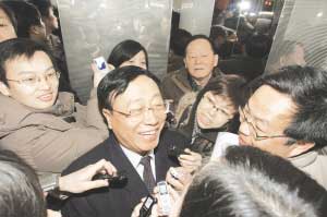 熱情的記者將電梯擠了個水泄不通,以致電梯門都無法合攏。最后,本報記者實在不忍范主席在狹小的電梯空間里無法“施展”,客串了一回“保鏢”,協助范主席成功“突出重圍”。
