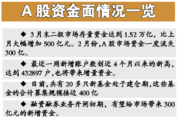 由上海證券報和申銀萬國研究所聯(lián)合推出的股市月度資金報告顯示,今年3月末,A股市場的存量資金在經(jīng)歷了近3個月的盤底振蕩后開始上升,當(dāng)月末二級市場存量資金達(dá)到1.52萬億,比上月大幅增加500億元。這個跡象,使得二月份一度明顯流失的市場資金面再度回穩(wěn),此前的2月份,A股市場資金一度流失300億。