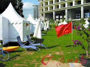 高端酒店咬定高價不放松,中低端酒店在亦步亦趨的同時還不忘廣開財源。在三亞灣,有酒店就推出體驗式帳篷,期待招徠客源。記者在三亞度假村酒店看到,這家酒店的草坪上,15頂白色帳篷已經搭起,里面不僅配備了床,水電也一應俱全,每個帳篷內還配備了環保廁所。
