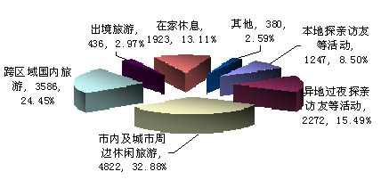 調(diào)查結(jié)果顯示,57.33%的受訪者計(jì)劃在國(guó)內(nèi)旅游,其中:32.88%受訪者有意在市內(nèi)及城市周邊休閑旅游,24.45%的受訪者有意跨區(qū)域國(guó)內(nèi)旅游;2.97%的受訪者計(jì)劃出境旅游;23.99%的受訪者有意探親訪友,其中:15.49%的受訪者計(jì)劃異地過夜探親訪友;13.11%的受訪者計(jì)劃在家休息。