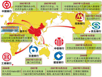 繼建行、中行和工行之后,交通銀行、民生銀行分別表示將在今年邁出海外并購(gòu)的步伐。加上去年10月,我國(guó)金融企業(yè)進(jìn)行的最大一筆海外收購(gòu)——工行以55億美元的價(jià)格收購(gòu)南非標(biāo)準(zhǔn)銀行20%股份,我國(guó)國(guó)有銀行進(jìn)軍國(guó)際市場(chǎng)已開足馬力。