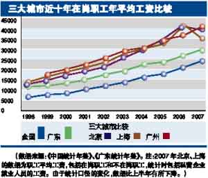 在廣東省內(nèi)6個主要城市之間,2007年廣州在崗職工年平均工資以40562元位居榜首,深圳在崗職工年平均工資以38798元緊隨其后,緊接著是東莞35284元,佛山28330元,中山27879元,珠海26616元。在廣州與深圳的比較中,2004年是“分水嶺”,在此之前,深圳的在崗職工年平均工資高于廣州,2005年開始廣州超越深圳。