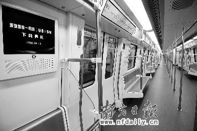 記者發(fā)現(xiàn),車廂比廣州3號線地鐵要寬敞。據(jù)介紹,廣州3號線地鐵車輛是B型車,寬度只有2.8米,又是直線型車體。相比之下,深圳地鐵一號線(續(xù)建)車輛車體寬達3.1米,且采用鼓形車體,視覺效果也要寬敞許多,據(jù)悉,最大載客量可達2502人。