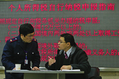 稅務(wù)工作人員指導(dǎo)納稅人填寫申報(bào)資料記者 陳誠 攝