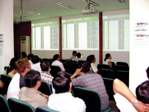 ORS證券公司位于胡志明市第一郡,與胡志明證券交易所一街之隔。隨著越南指數(shù)從2007年3月12日的歷史最高點(diǎn)1170點(diǎn)跌至今年6月的370點(diǎn)低位,幾月以來,這里已經(jīng)成了大多數(shù)股民的“傷心地”。不過,昨天上午9點(diǎn),想在這里找到一個(gè)位子已經(jīng)不太容易。而交易大廳偶爾響起的掌聲更將人們心頭的陰霾一掃而空,“漲了。”幾個(gè)股民對自己的收獲很滿意。