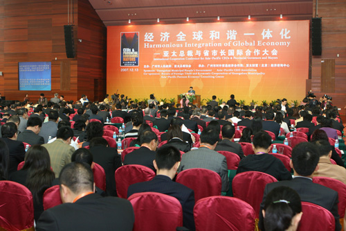 本次大會開幕式,由廣州市副市長陳明德主持,張廣寧市長和鮑勃•霍克主席分別致辭。張廣寧市長指出,當今世界,經濟全球化和區域經濟一體化進程不斷加快,為各國、各地區經濟要素在全球范圍的優化配置和經濟效益的提高創造了有利條件。但是目前全球化進程也充滿矛盾和不均衡,如何正確認識和妥善應對全球化,建立長期聯系的穩定有效機制,推進全球化進程朝著均衡、普惠、共贏的方向發展,創建共同繁榮的和諧世界,是許多具有遠見卓識的人士共同關心的重大問題。張市長呼吁,亞太地區各方更應進一步加強相互間的交流與溝通,增進彼此間的合作,共同促進亞太地區乃至全球經濟的繁榮和持續發展。