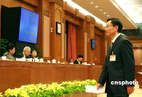 中國財政部部長謝旭人作關(guān)于提請審議《中華人民共和國個人所得稅法修正案(草案)》的議案說明。中新社發(fā) 廖文靜 攝
