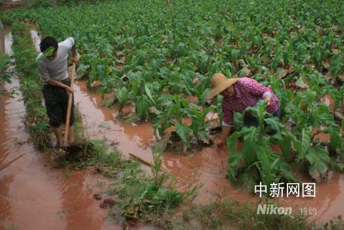 黃煙主產區主田鎮煙農在排積水、清洗煙葉泥漬。