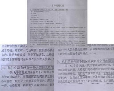 圖片01:深圳晚報特稿部記者曾以應聘者的身份在金股之王呆了9天,他告訴記者,在這個話術里,詳細歸納了每次給客戶打電話應注意事項及如何說服不同類型客戶。 圖片來源:新華網