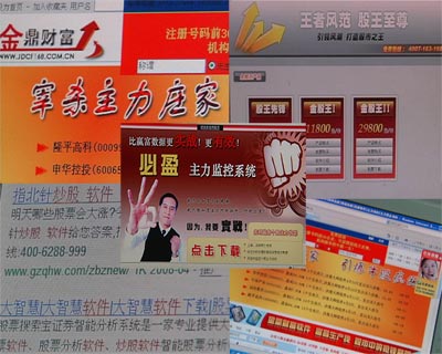 圖片03:在這些兜售炒股軟件的廣告上,極具誘惑力的廣告語隨處可見,中國證券業協會副會長林義相在證券行業從業多年,他告訴記者,這些炒股軟件絕不可信。 圖片來源:新華網