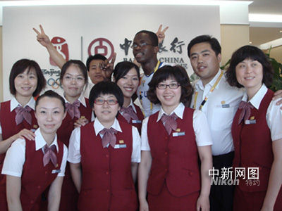 中國(guó)銀行運(yùn)動(dòng)員村支行員工與即將回國(guó)的110米欄奧運(yùn)冠軍羅伯斯合影留念