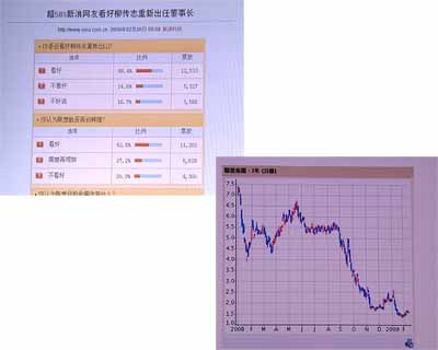 2月5日,聯(lián)想宣布柳傳志重掌聯(lián)想的消息后,新浪網(wǎng)隨后對(duì)柳傳志復(fù)出進(jìn)行了問卷調(diào)查。截至第二天上午九點(diǎn)就有兩萬余人參與調(diào)查,結(jié)果顯示:58.4%的網(wǎng)友看好柳傳志重新出任董事長(zhǎng),選擇不看好的只有24.8%,認(rèn)為聯(lián)想因此能再創(chuàng)輝煌的網(wǎng)友達(dá)52.5%,市場(chǎng)層面也反應(yīng)積極,聯(lián)想集團(tuán)股票在2月6日大漲11%,而在今年以來,聯(lián)想股價(jià)已經(jīng)下跌了33%。