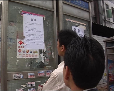 這就是他們倆頭一天交錢的地方,如今已是人去樓空,李美銳和肖方云白白損失了20塊錢,不過最終在記者的建議下,兩人還是在幾經打聽后,來到了附近的一個勞動力市場,這是個很正規的中介機構,但在市場轉了一會后,兩人又碰到了一個難題。