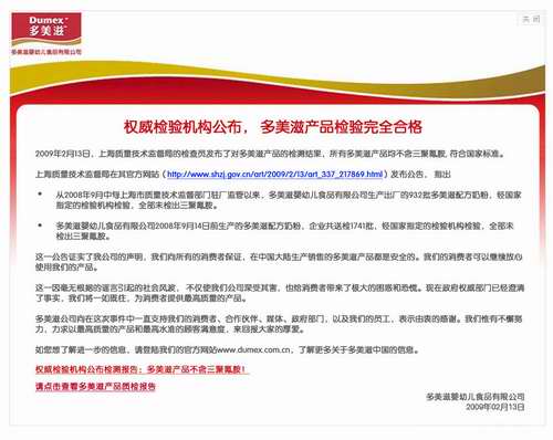 對(duì)于報(bào)道中介紹的那些患兒,我深表關(guān)切,我們理解父母?jìng)儞?dān)憂的心情。但迄今沒(méi)有醫(yī)學(xué)報(bào)告可以證明任何多美滋產(chǎn)品與這些病癥的關(guān)聯(lián)性。我想再次向我們的員工申明,多美滋在國(guó)內(nèi)生產(chǎn)銷(xiāo)售的奶粉全部符合中國(guó)相關(guān)標(biāo)準(zhǔn)。所有批次的產(chǎn)品都經(jīng)過(guò)了官方認(rèn)證的實(shí)驗(yàn)室的檢驗(yàn),被確認(rèn)不含三聚氰胺。同時(shí),質(zhì)檢系統(tǒng)駐廠人員還在對(duì)我們(當(dāng)然還有其它所有的乳品品牌)的生產(chǎn)和產(chǎn)品質(zhì)量進(jìn)行不間斷的監(jiān)督。