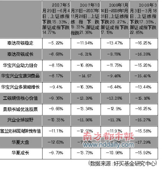 3月份以來,受到股市拖累的股票型基金,凈值下跌最少的也有10%,最多損失超過24%.然而同樣是凈值縮水,今年以來績(jī)優(yōu)與績(jī)差基金之間的差距居然高達(dá)30%,尋找抗跌的基金已經(jīng)成為今年基金投資的一個(gè)主要命題。好買基金研究中心樂嘉慶指出,從去年5月底至今,股市共經(jīng)歷了4個(gè)跌幅超過15%的階段。在4個(gè)階段中比較抗跌的基金表現(xiàn)出兩大特點(diǎn),一是行業(yè)投資比較均衡的基金,另一個(gè)則是規(guī)模適中,倉位調(diào)整迅速的基金。