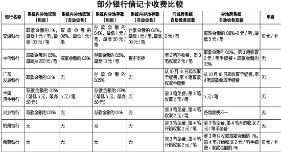 根據目前杭州各家銀行公布的收費標準看,四大銀行的銀行卡收費標準是最高的。記者咨詢了多家銀行的收費標準,市民在選辦銀行卡時,不妨做個比較。(黃丹)
