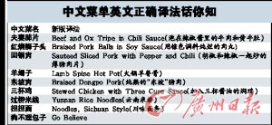粵菜在北京占有一席之地,順峰酒樓北京區總監胡景泉給記者搬出了好幾本制作精良的雙語菜單,在一本菜單上,集山珍海味之大全的“養生佛跳墻”被音譯成Fotiaoqiang,并在后面注有英文解釋,據介紹,其實這個譯法已沿襲多年了。