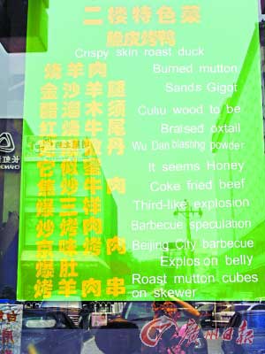在《中文菜單英文譯法》出臺之前,北京中式餐館常常開起“國際玩笑”,比如紅燒獅子頭被譯成“RedBurnedLionHead”(燒紅了的獅子頭),“驢打滾”被譯成“Rollingdonkey”(打滾的驢),“老虎菜”被錯譯成“tigerdish”(老虎做的菜),“童子雞”被譯成“Chickenwithoutsexuallife”(沒有性生活的雞)。老外們往往啼笑皆非或嚇得不輕。