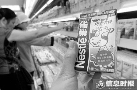 在家樂(lè)福超市萬(wàn)國(guó)廣場(chǎng)店,記者看到光明純牛奶250毫升裝悄然回歸賣(mài)場(chǎng);在吉之島超市天河城店,記者看到,昨日還未貼上綠簽的雀巢巧克力味和草莓味的配制型含乳飲料,昨日悄然換新裝。其生產(chǎn)日期標(biāo)注為“2008年6月6日”,早于9月14日這一“分水嶺”。同時(shí),記者在7-11便利店天河南店也看到了雀巢這兩款配制型含乳飲料重新擺上貨架售賣(mài)。