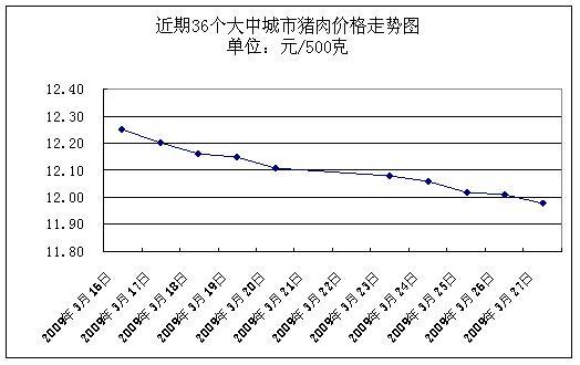 中新網3月30日電 據國家發展改革委價格監測中心監測,上周(2009.3.23-2009.3.27,下同)36個大中城市集市、超市豬肉(精瘦肉)平均零售價格每500克為12.03元,與前一周(2009.3.16-2009.3.20,下同)相比下降1.15%。