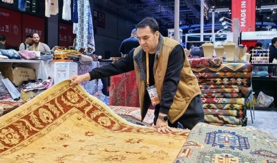 趁著客流稍微減少,哈默德·拉爾夫抓緊時間打理起自己的地毯。一張又一張圖案豐富的阿富汗地毯依次攤開,恰如一個又一個故事,講述著這位進博會“全勤生”與中國的情緣。