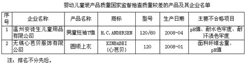 抽查結(jié)果表明,一是此次抽查嬰幼兒童裝產(chǎn)品的甲醛含量、可分解芳香胺染料、異味、耐唾液色牢度及產(chǎn)品標(biāo)識(shí)等項(xiàng)目單項(xiàng)符合率達(dá)到100%。二是市場(chǎng)占有率較高的大型生產(chǎn)企業(yè)產(chǎn)品質(zhì)量較好,所檢項(xiàng)目全部符合國(guó)家標(biāo)準(zhǔn)規(guī)定的要求。