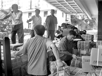 工作人員正在向災區發運教材。 本報記者 王立強 攝