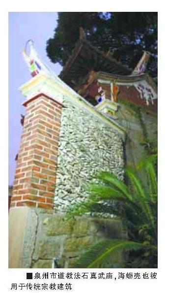 然而就在小洋樓之間,記者見到了蟳埔的另一個特色——用海蠣殼蓋成的房子,當(dāng)?shù)胤Q作“蚵殼厝”。特別是在老房子集中的村落,“蚵殼厝”一個連著一個,細(xì)細(xì)看去別有風(fēng)味。有些人家蓋新房的時候依舊選用海蠣殼做材料,不過裝飾的意味要超過就地取材的功能了。記者在村中走訪時就看到了一處新建的院落,外墻的上半部用海蠣殼填充,裝飾得非常漂亮。院子里面男人、女人分別圍著一個大桌子吃午飯,中間隔得很遠(yuǎn)。女人們都插著滿頭的鮮花,根據(jù)記者幾天來了解的情況分析,這一天應(yīng)該是對這個家庭非常重要的日子。院子里正對大門的是祠堂,房子的女主人告訴記者,他們建這個院子花了30萬元,平時并沒有人住,這里只是供奉、祭祀祖先的地方。
