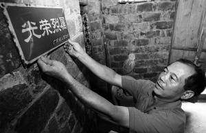 ?诃偵絽^龍寒村抗美援朝烈士吳業忠之子吳田川,展示政府頒發的光榮烈屬的牌匾。 海南日報記者 李英挺 攝