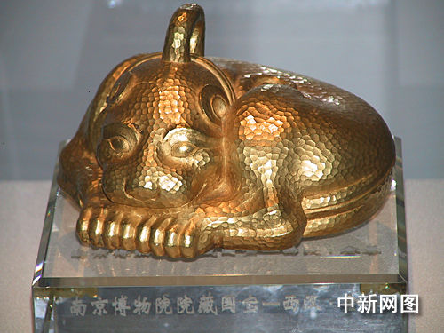 記者隔著玻璃窗看到,一只脖套項(xiàng)圈的金豹身覆鱗片,半蹲于座,鱗片在燈光映照下閃爍,光彩灼人,整座展品有著強(qiáng)烈的立體感。“這叫金獸,古時作保財(cái)鎮(zhèn)庫之用,迄今為止仍是中國出土文物中最大最重的金器”,南京市博物院院長龔良如是說。