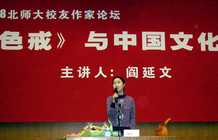 日前,女作家閻延文應(yīng)母校北師大文學(xué)院邀請(qǐng),在北師大針對(duì)文化熱點(diǎn)問題,進(jìn)行了一場(chǎng)題為《色戒與中國文化》的講座。英東學(xué)術(shù)會(huì)堂,在講座開始前即已爆滿,兩個(gè)小時(shí)的講座始終處在熱烈氣氛中。