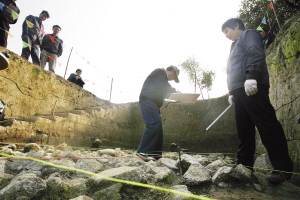 石頭地基的遺址很快被探明,它向北頂?shù)搅藮|苕溪,往南頂?shù)搅锁P山,總長度約1000多米,寬約40~60米。