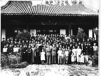 這張老照片可不是大戶人家的集體合影,而是一張不同尋常的結婚照。其不尋常之處在于:它反映了北京和平解放后,第一個新式婚禮的隆重場面。照片中間位置胸戴大紅花,表情有些羞澀的一對新人正是新式婚禮的主角。
