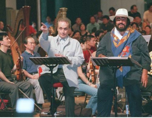 2001年6月,先期到達北京參加世界三大男高音午門演唱會的帕瓦羅蒂和卡雷拉斯,20日下午與中國中央歌劇院的演員和樂隊一起排練。 中新社發 李剛 攝